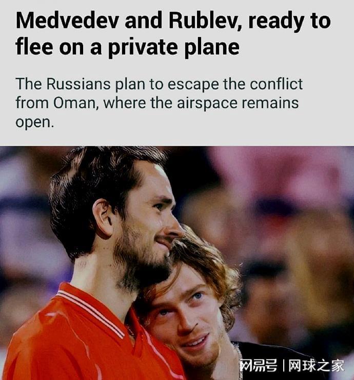 还没有逃离迪拜的俄罗斯名将梅德维德夫和卢布列夫目前还都在签表之中。有外媒报道,称俄罗斯两兄弟已经选择了一条走陆路离开迪拜的路线,计划先到阿曼,然后乘私人飞机转道土耳其再飞往印第安维尔斯。但愿他们安全脱身,也希望其他滞留在迪拜的球员也能安全撤离。